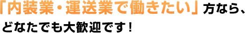 内装・運送業をメインに事業展開している秀香では、一緒に働く仲間を募集しております。「求める人物像」や「募集要項」をご覧いただき、ご興味を持たれた方であればどなたでもご応募ください。